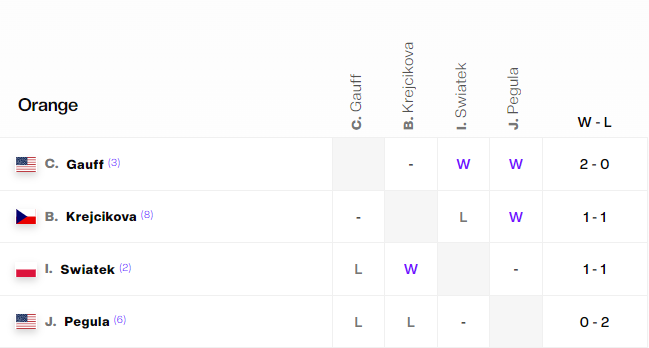 Гофф із двома перемогами вже гарантувала собі вихід до півфіналу. За останню путівку до 1/2 фіналу боротимуться Іга та Барбора, у яких по 1 очку (1 перемога). Джессіка втратила шанси вийти у півфінал.