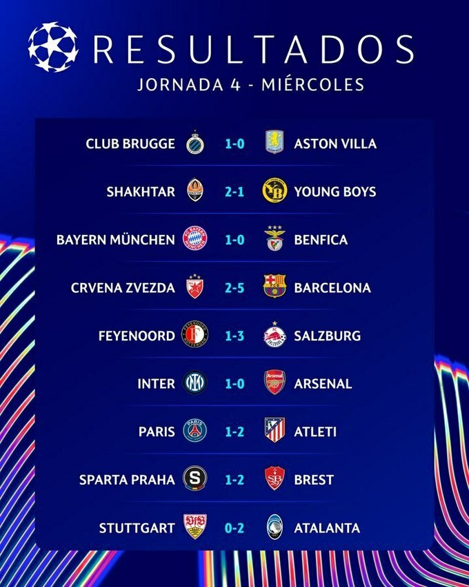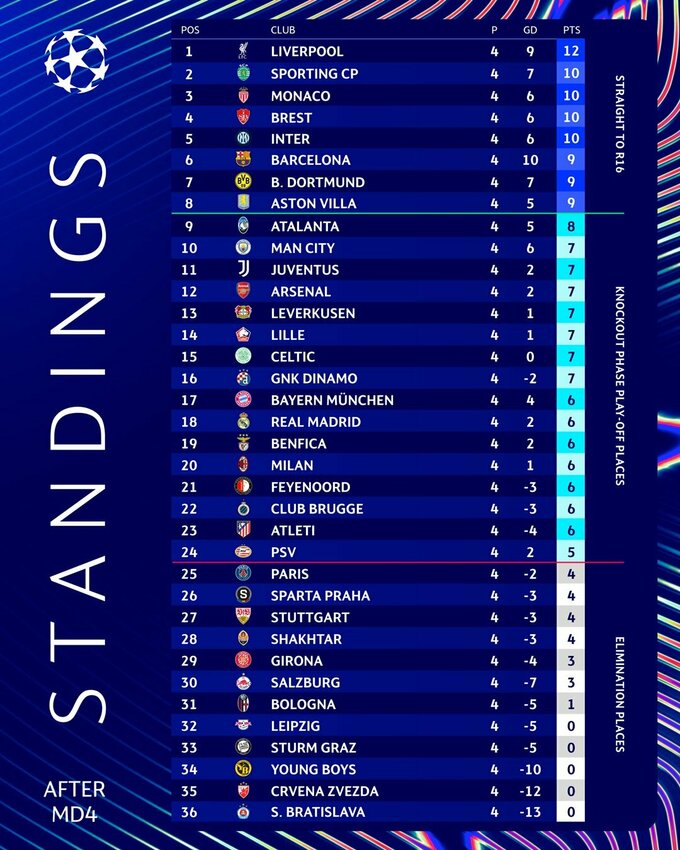Англійський Ліверпуль очолює гонку, маючи 4 перемоги поспіль (12 очок). Далі йдуть Спортинг, Монако, Брест, Інтер (10), Барселона, Боруссія Д, Астон Вілла (9).