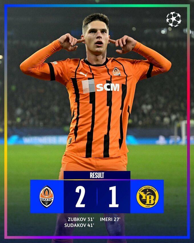 Донецький Шахтар у німецькому Гельзенкірхені виграв у швейцарського клубу Янг Бойз (2:1). Пропустивши першими, гірники здобули вольову перемогу завдяки голам Олександра Зубкова та Георгія Судакова.