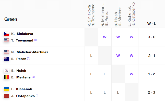 У півфінал із цього квартету пробилися пари Синякова / Таунсенд та Меліхар / Перес. На старті плей-оф вони зіграють проти другого та першого тандему Білої групи відповідно.