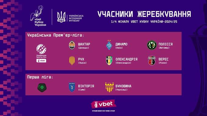 У жеребкуванні візьмуть участь «Олександрія», «Рух», «Буковина», «Полісся», «Динамо», «Шахтар», «Верес» та «Вікторія».