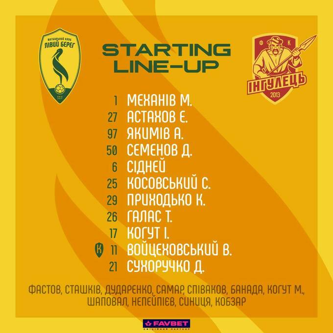 «Лівий Берег»: Механів – Сіднней, Семенов, Якимів, Астахов – І. Когут (М. Когут, 66), Приходько (Співаков, 66), Галас (Синиця, 46), Косовський, Войцеховський (Непейпієв, 66) – Сухоручко (Кобзар, 90+2).