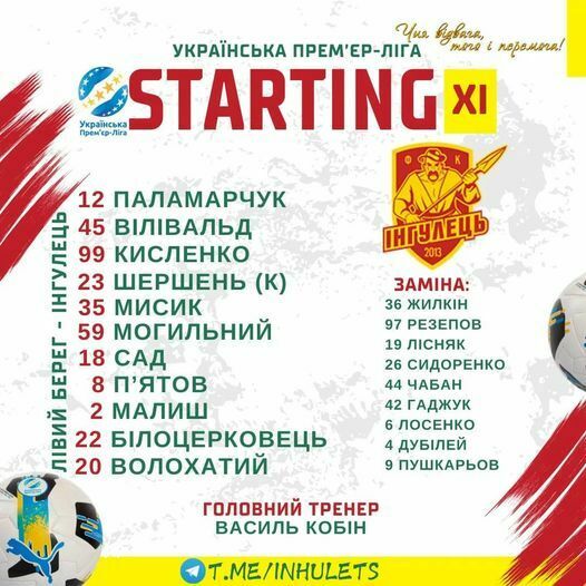 «Інгулець»: Паламарчук – Мисик, Малиш, Шершень, Вілівальд, Білоцерковець – Сад (Лосенко, 90+3), Волохатий, П’ятов (Лісняк, 70) – Могильний (Резепов, 70) – Кисленко.