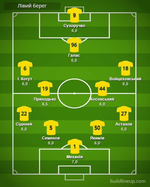 «Лівий Берег»: Механів – Сідней, Семенов, Якимів, Астахов – І. Когут (М. Когут, 66), Приходько (Співаков, 66), Галас (Синиця, 46), Косовський, Войцеховський (Непейпієв, 66) – Сухоручко (Кобзар, 90+2).