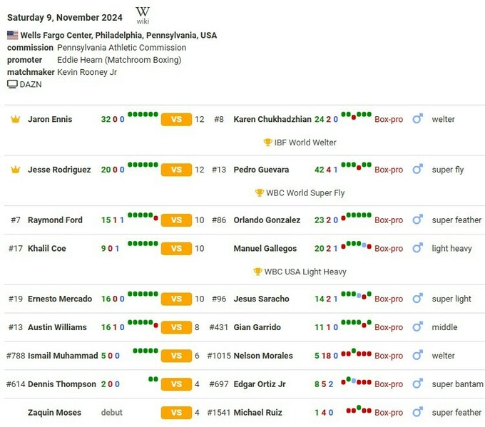 Головна подія – це бій-реванш. На ринг вийдуть чемпіон світу IBF Джарон Енніс із США (32–0, 29 КО) та Карен Чухаджян із України (24–2, 13 КО).