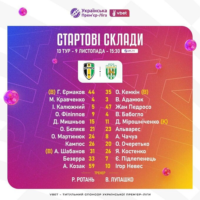 9 листопада відбудеться матч 13-го туру Української Прем'єр-ліги, в якому зіграють «Олександрія» та «Карпати».