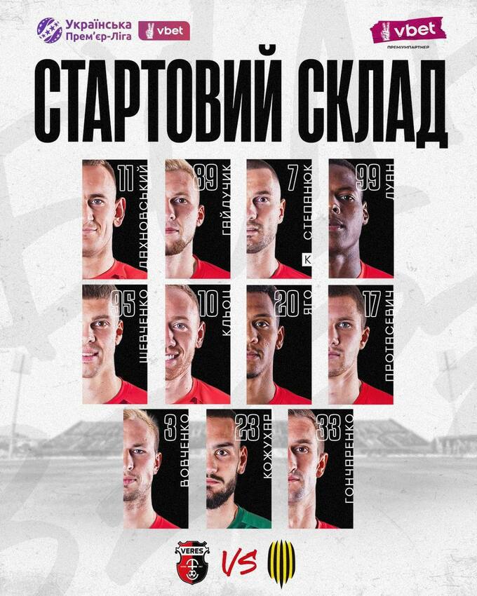 «Верес»: Кожухар – Шевченко, Вовченко, Гончаренко, Протасевич – Кльоц (Баран, 90+4), Яго – Дахновський (Годя, 75), Луан – Гайдучик (Мрвальєвич, 75), Степанюк.