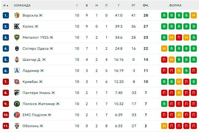 - Топ-шістка: Ворскла (28 очок), Колос (27), Металіст 1925 (23), Сістерс (22), Шахтар (14), Ладомир (11).