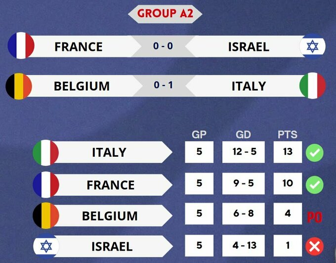 У лізі A Італія переграла Бельгію (1:0), а Франція та Ізраїль розійшлися миром (0:0).