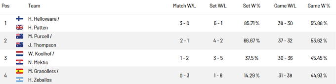 У підсумку до півфіналу ATP Finals пробилися пари Хелієваара / Паттен та Перселл / Томпсон, які посіли 1-ше та 2-ге місця у квартеті з трьома та двома перемогами відповідно.