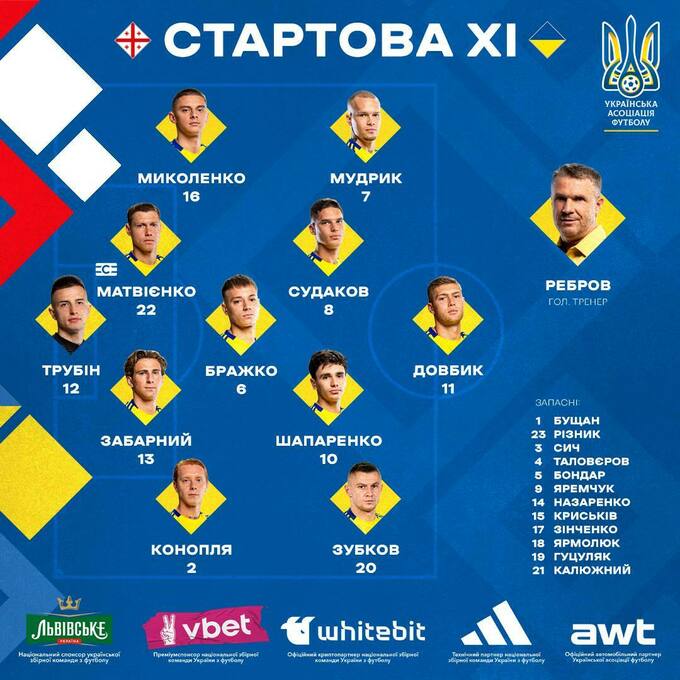 Головний тренер синьо-жовтих Сергій Ребров назвав стартовий склад команди.