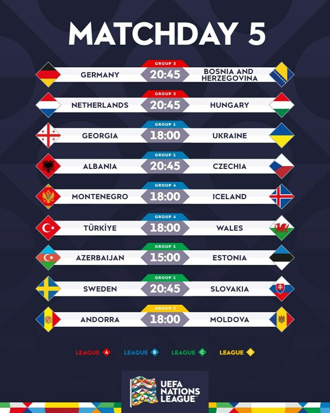 Увечері 16 листопада відбуваються поєдинки 5-го туру Ліги націй.
