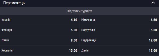 Другим претендентом на трофей є команда Німеччини – 4.50. Реальні шанси і у Франції з Португалією – 5.00 та 5.50 відповідно.