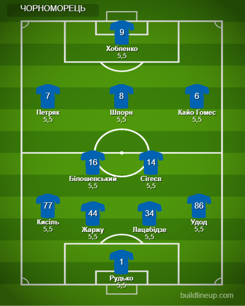 «Чорноморець»: Рудько – Кисіль, Жаржу (Скиба, 77), Лацабідзе, Удод, Білошевський (Габелок, 64), Сігеєв (Шевцов, 77), Шпорн, Петряк, Кайо Гомес (Пшеничнюк, 88), Хобленко.