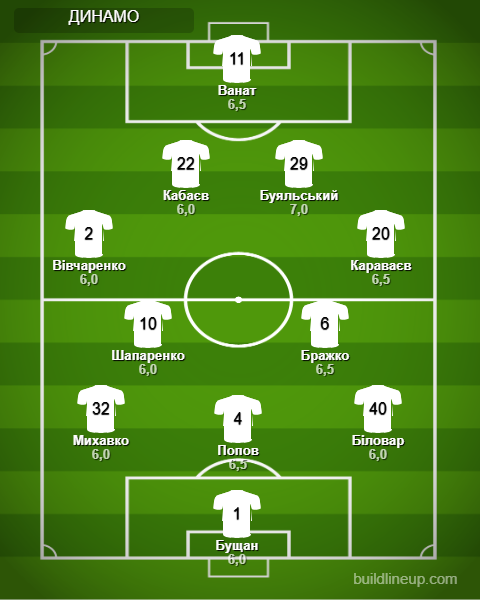 «Динамо»: Бущан – Михавко, Попов, Біловар, Вівчаренко, Шапаренко (Михайленко, 84), Бражко, Караваєв (Волошин, 77), Кабаєв (Рубчинський, 84), Буяльський (Саленко, 90), Ванат (Герреро, 77).