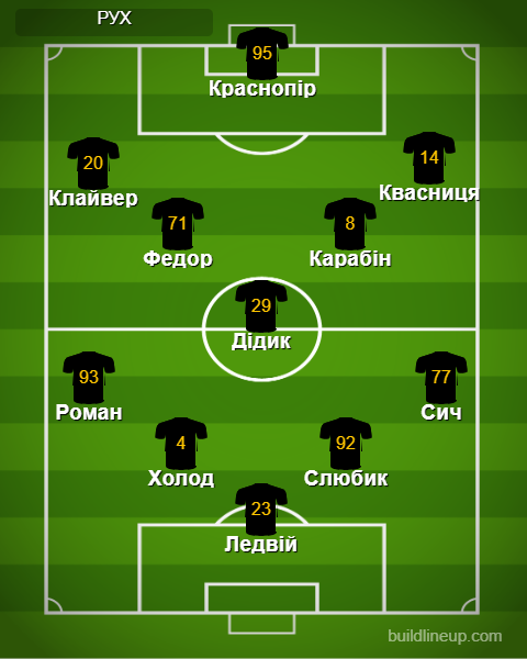 «Рух»: Ледвій – Cич, Холод, Слюбик (Підгурський, 52), Роман – Дідик – Квасниця, Федор (Руніч, 78), Карабін (Плюман, 78), Клайвер (Притула, 67) – Краснопір (Климчук, 67)