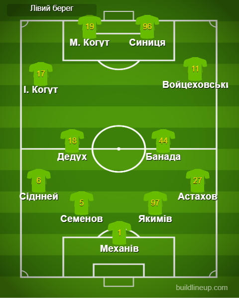 «Лівий берег»: Механів – Астахов, Якимів, Семенов, Сіднней – Банада (Співаков, 46), Дедух – Войцеховський (Галас, 78), І. Когут (Непейпієв, 78) – М. Когут (Кобзар, 85), Синиця (Сухоручко, 46)
