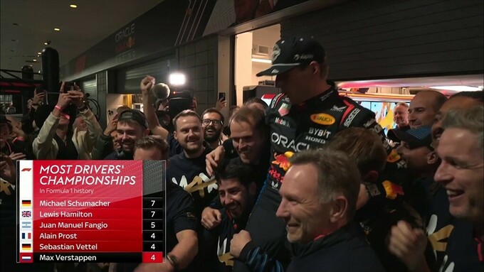 Гонщик Ред Булла Макс Ферстаппен оформив 4-й чемпіонський титул Формули-1, наздогнавши за кількістю чемпіонств Алена Проста та Себастьяна Феттеля.