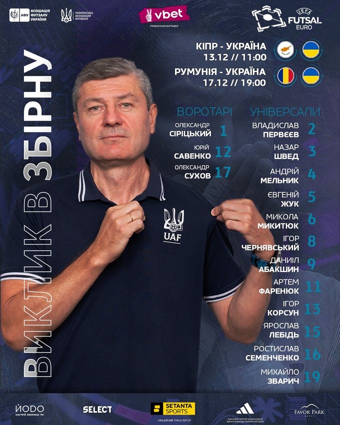 13 грудня національна збірна України з футзалу зіграє з Кіпром, а 17 – підопічні Олександра Косенка зустрінуться з національною командою Румунії.