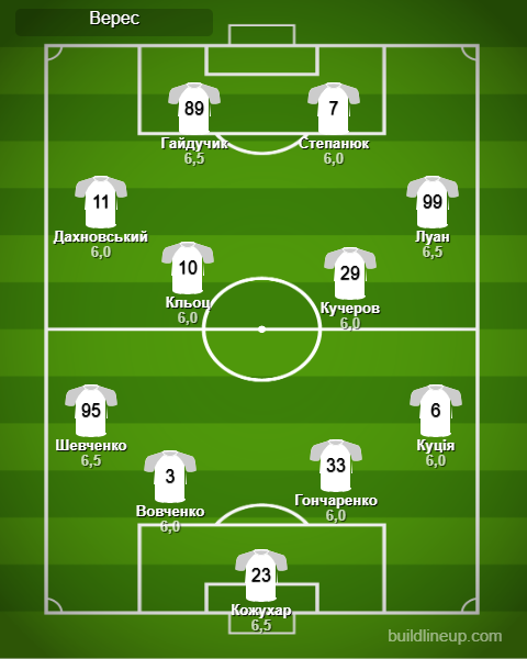 «Верес»: Кожухар – Шевченко, Вовченко, Гончаренко, Куція (Протасевич, 75) – Кльоц, Кучеров – Дахновський (Шарай, 46), Луан (Годя, 84) – Гайдучик (Мрвальєвич, 74), Степанюк (Нонго, 84).