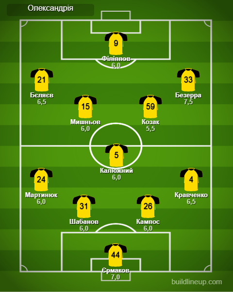 «Олександрія»: Єрмаков – Мартинюк, Шабанов, Кампуш, Кравченко (Скорко, 69) – Мишньов (Джевані, 46), Калюжний, Козак (Ковалець, 46) – Бєляєв (Плакса, 79), Філіппов (Кулаков, 79), Безерра.