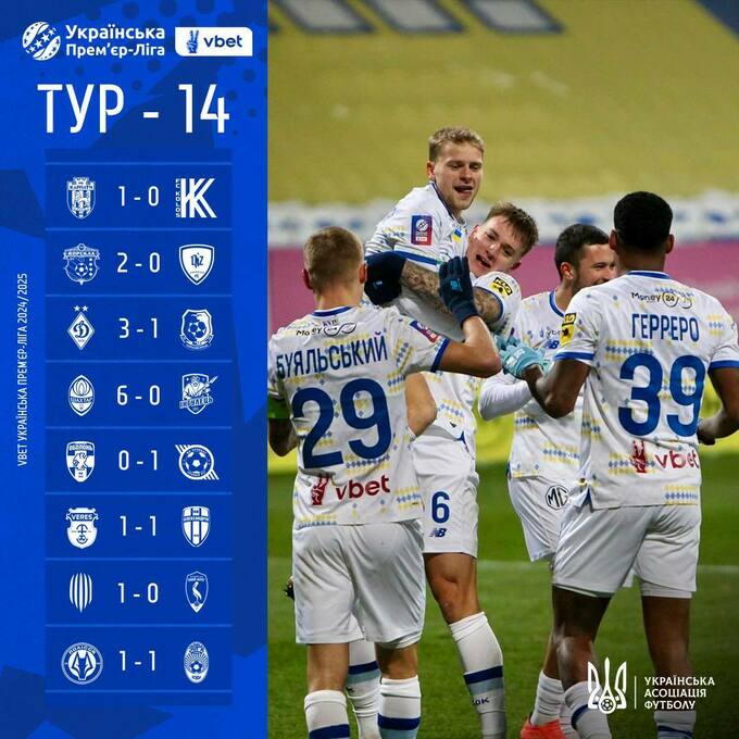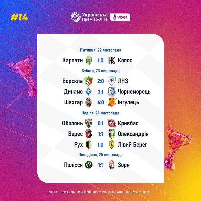 З 22 до 25 листопада відбулися матчі 14-го туру Української Прем'єр-ліги 2024/25.