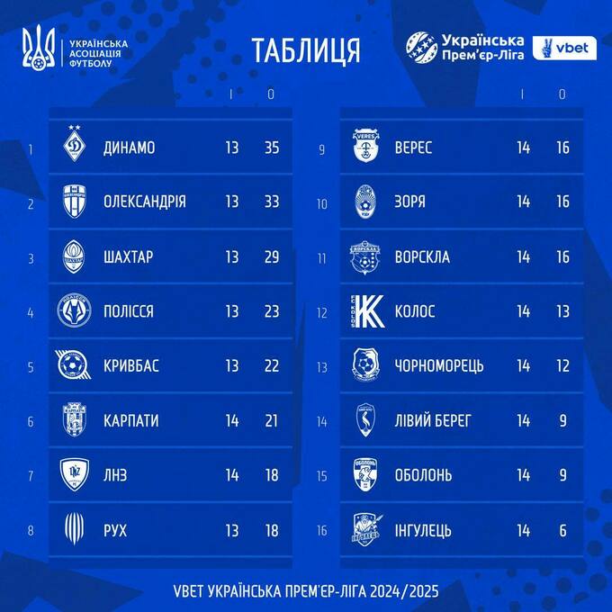 | 1 | Динамо Київ | 13 | 11 | 2 | 0 | 32 - 10 | 35 | ||