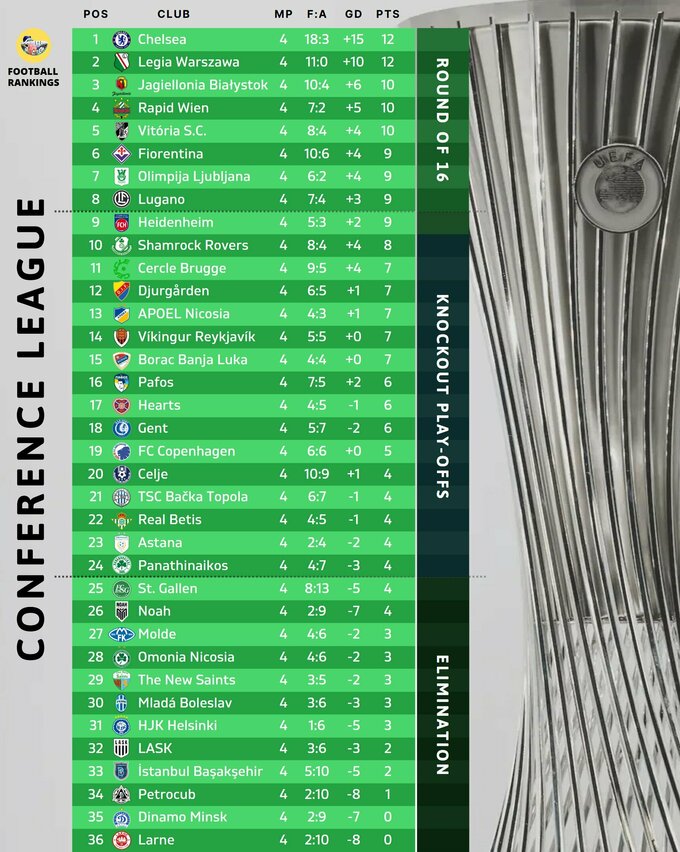 Лондонський клуб набрав 12 очок із 12 і лідирує у Лізі конференцій. До топ-5 також входять: Легія (12), Ягеллонія, Рапід, Віторія Гімараєш (по 10). Ці клуби забезпечили собі місця у плей-оф ЛК.