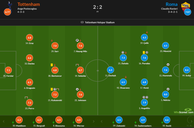 Український форвард «Роми» Артем Довбик провів на полі всі 90 хвилин. За цей час українець не відзначився результативними діями, однак на 55-й хвилині Артем забив гол, який відмінили через офсайд. Статистичний портал WhoScored оцінив гру українця у 6.3 бали. Таку ж оцінку має одноклубник Довбика Зекі Челік. Це найгірший показник серед всіх гравців «Роми». Найкращим гравцем матчу став голкіпер «вовків» Міле Свілар, який отримав оцінку 8.4 балів.