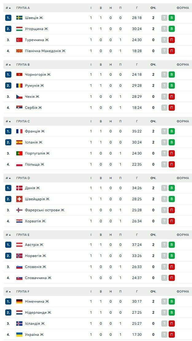 Гандбол ЧЄ. Підсумки 1-го туру та турнірні таблиці. Невдалий старт українок