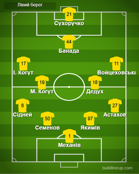 «Лівий берег»: Механів – Сідней, Семенов, Якимів, Астахов – І. Когут (Галас, 63), Банада (Косовський, 54), М. Когут (Кобзар, 82), Дедух (Співаков, 82), Войцеховський (Непейпієв, 63) – Сухоручко