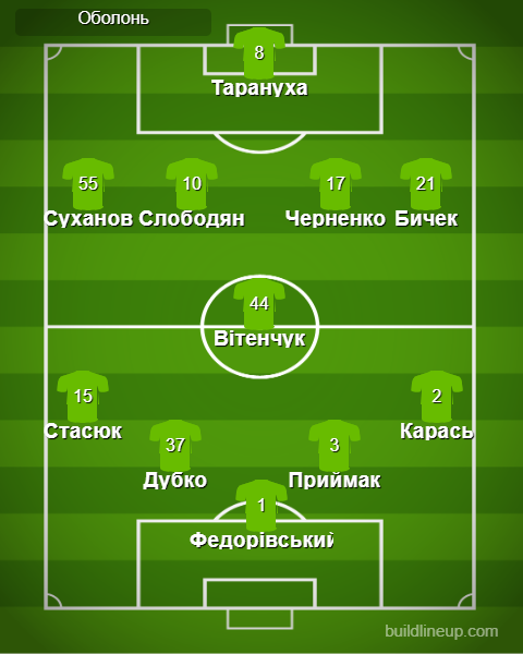 «Оболонь»: Федорівський – Стасюк, Дубко, Приймак, Карась – Вітенчук – Суханов (Теслюк, 72), Черненко (Чорний, 90+5), Слободян (Мороз, 72), Бичек (Блізніченко, 63) – Тарануха (Лях, 90+5)
