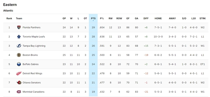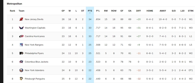 Лідерами східної конференції НХЛ залишаються Нью-Джерсі та Вашингтон, які сьогодні виграли свої матчі. Дияволи обіграли Детройт 5:4, закинувши три шайби у більшості. Команда виграла 9 з 12 останніх зустрічей, набрала 34 очки та на 1 пункт випереджає Столичних, які здолали Нью-Йорк Айлендерс 5:4 в овертаймі.