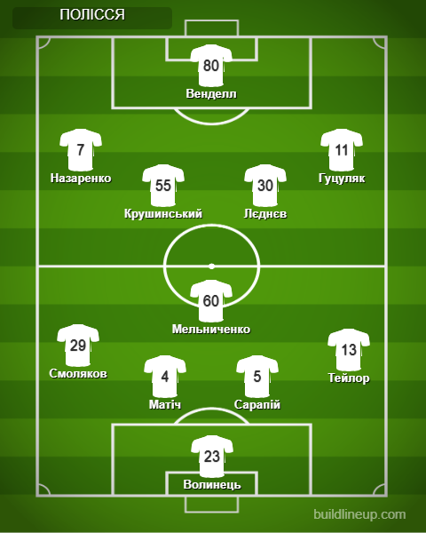 «Полісся»: Волинець – Матіч, Сарапій, Тейлор (Мустафаєв, 72), Смоляков, Мельниченко, Крушинський (Пайшау Соса, 80), Лєднєв (Михайліченко, 72), Гуцуляк, Назаренко, Венделл (Макуана, 46).