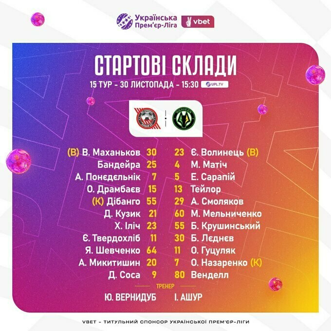 Запасні: Кліщук, Хома, Конате, Романчук, Аморозо, Ндомбазі, Жан По, Хомченовський, .
