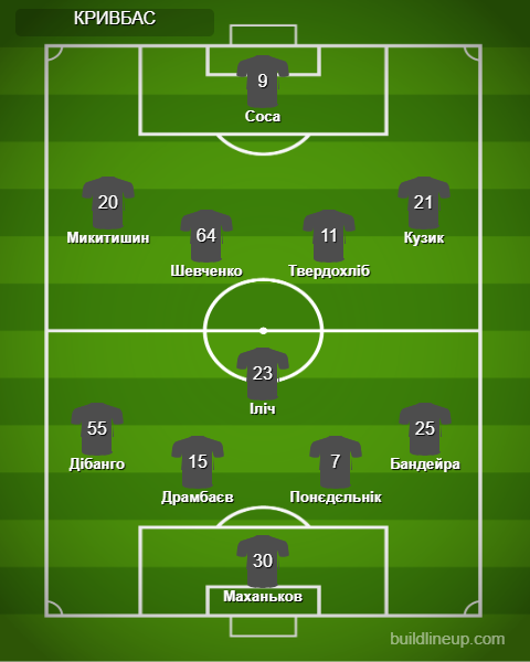«Кривбас»: Маханьков – Бандейра (Задерака, 89), Понєдєльнік, Драмбаєв, Дібанго, Кузик, Іліч, Твердохліб, Шевченко (Бізімана, 68), Микитишин (Каменський, 80), Соса (Кожушко, 89).