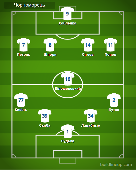 «Чорноморець»: Рудько – Кисіль, Скиба, Лацабідзе, Бутко – Білошевський (Кайо, 67) – Петряк, Шпорн (Габелок, 82), Сігеєв (Єрмаков, 82), Попов (Янаков, 68) – Хобленко.