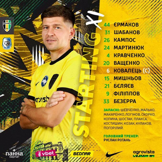 Запасні: Аніагбосо, Вічний, Арсич, Пшеничнюк, Васильєв, Удод, Жаржу.