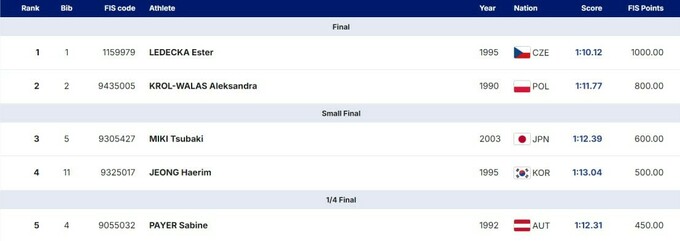 Переможницею першого старту стала спортсменка збірної Чехії Естер Ледецка. Вторая – Александра Кроль-Валас із Польщі й на третьому місці японка Мікі Цубакі.