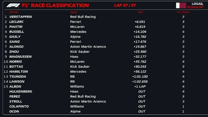 Відбулася гонка Формули-1 у рамках Гран-прі Катару. Перемогу здобув пілот Ред Булла Макс Ферстапппен, який стартував другим, але одразу ж випередив Джорджа Расселла і оформив свою чергову перемогу. Другим фінішував Шарль Леклер, а топ-3 замкнув Оскар Піастрі.