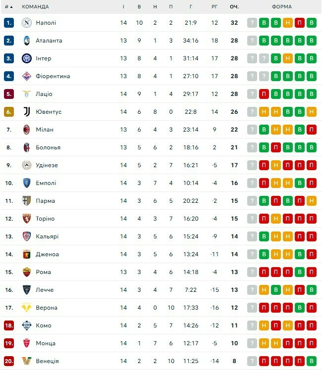 Велика щільність спостерігається серед лідерів Серії A: Наполі (32 очки), Аталанта, Інтер, Фіорентина, Лаціо (28), Ювентус (26), Мілан (22), Болонья (21).