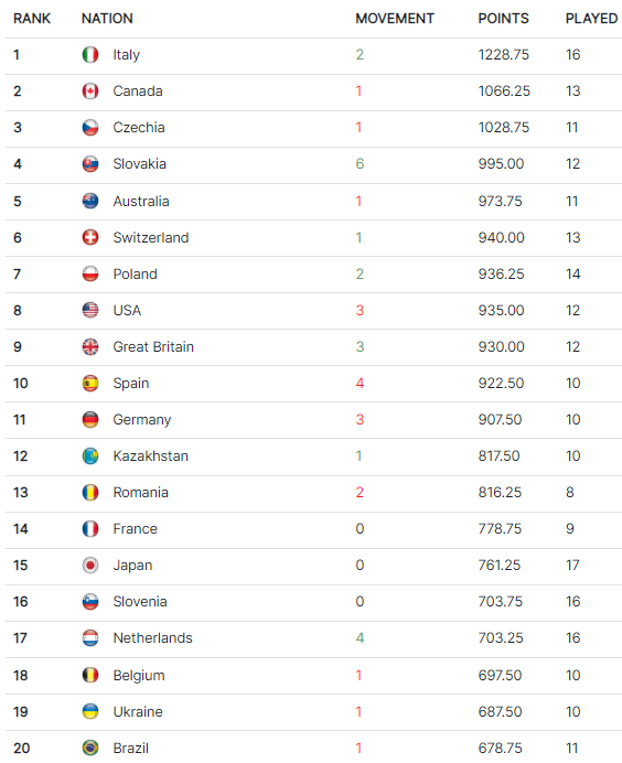 Великий стрибок зробила і Словаччина, яка дісталася фіналу КБДК. Команда Словаччини піднялася на 6 місць і тепер іде четвертою у рейтингу.