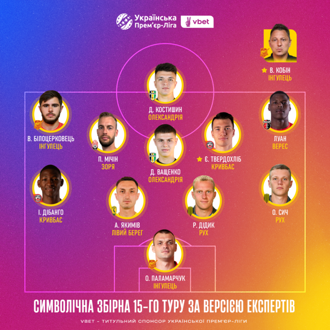 Українська Прем'єр-ліга визначила символічну збірну, а також назвала найкращого гравця та найкращого тренера 15-го туру УПЛ.