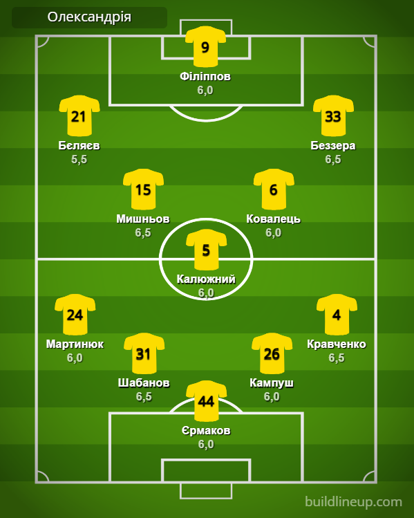 «Олександрія»: Єрмаков – Мартинюк, Шабанов, Кампуш, Кравченко – Мишньов (Шостак, 75), Калюжний, Ковалець (Козак, 64) – Бєляєв (Костишин, 63), Філіппов (Кулаков, 75), Безерра.
