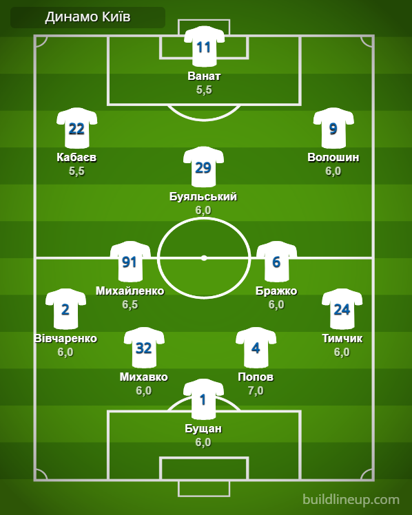 «Динамо» Київ: Бущан – Вівчаренко, Михавко, Попов, Тимчик – Михайленко (Рубчинський, 90), Бражко – Кабаєв (Караваєв, 68), Буяльський, Волошин – Ванат.