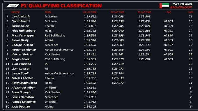 Відбулася кваліфікація останнього етапу сезону Формули-1 в Абу-Дабі. Поул завоював пілот Макларена Ландо Норріс, який випередив напарника Оскара Піастрі та Карлоса Сайнса на Феррарі.