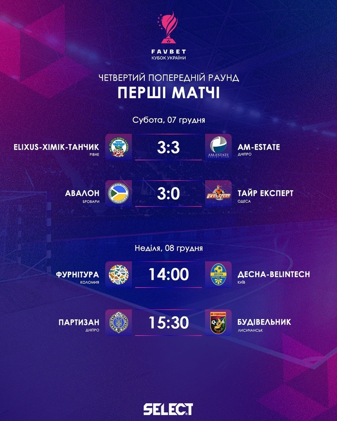 Також 8 грудня зіграють ще два матчі: Фурнітура-Експрес-24 (Коломия) – Десна-Belintech (Київ), Партизан (Дніпро) – Будівельник (Лисичанськ).