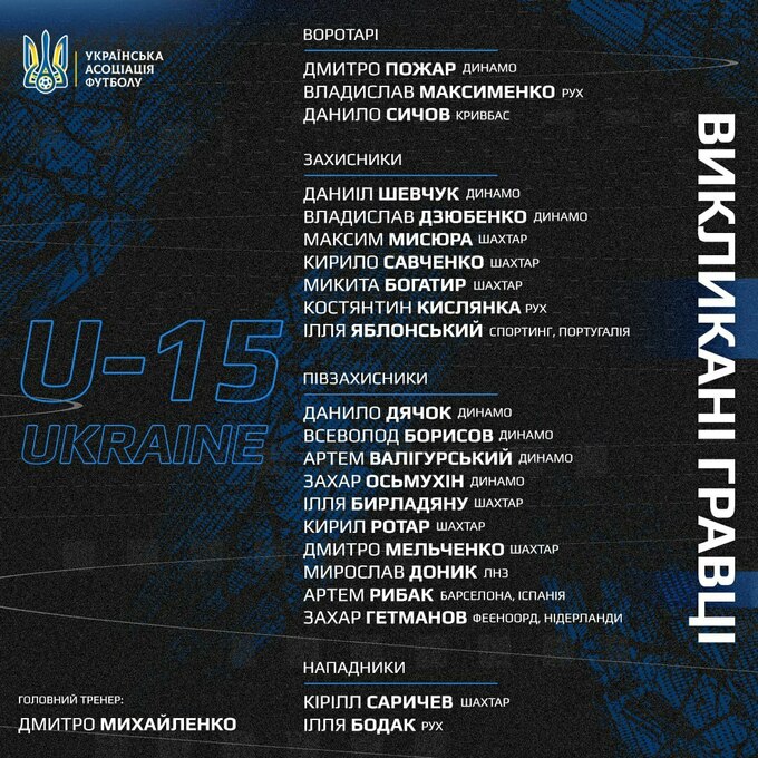 Цікаво, що в списку лише 3 гравці представляють закордонні клуби: Ілля Яблонський («Спортінг», Португалія), Артем Рибак («Барселона», Іспанія) та Захар Гетманов («Феєнорд», Нідерланди). Також варто відзначити виклик хавбека ЛНЗ Мирослава Доника – володаря «Золотого м'яча» ДЮФЛУ 2024.