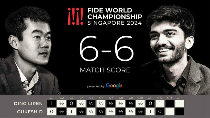 Дін зрівняв рахунок (6:6). Залишається зіграти дві партії (11 та 12 грудня) після дня відпочинку. У разі рівного рахунку – на 13 грудня заплановано тай-брейк із укороченим контролем часу. Призовий фонд матчу – 2,5 млн доларів.
