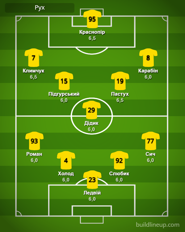 «Рух»: Ледвій – Роман (Лях, 88), Холод, Слюбик, Сич – Підгурський (Федор, 46), Дідик, Пастух – Климчук (Квас, 88), Краснопір (Квасниця, 56), Карабін (Клайвер, 67).